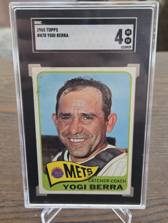 Yogi Berra Baseball Card - "Yogi" Berra was an American professional baseball catcher who later took on the roles of manager and coach. He played 19 seasons in Major League Baseball (MLB), all but the last for the New York Yankees. He was an 18-time All-Star and won 10 World Series championships as a player—more than any other player in MLB history. Thecard is numbered 470, from the 1965 Topps set. This card was graded by SGC as very good to excellent condition, sgc4.
