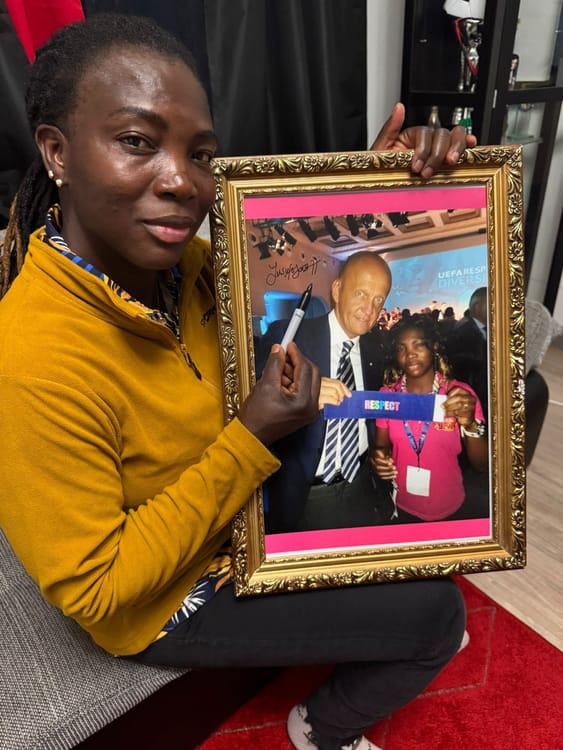 Frame photo of football legends Ayisat Endurance Yusuf & an Italian former football referee Pierluigi Collina.