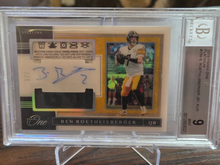 2019 Panini One Platinum #159 Ben Roethlisberger Jersey Card Autographed 1/3 Graded and encapsulated by Beckett Grading Services and rated a 9, MINT Condition.