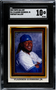 This is an authentic 2022 Topps Gallery baseball card of Vladimir Guerrero Jr. in a game on April 13, 2022. This is when he had his 3 Home Run Game, of which the third home run traveled an astounding 443 feet in the air! This limited-edition card is numbers PG-3 (Portrait Gallery #3) and was made by Topps. The card was graded a perfect 10 by SGC. 5919862 is the SGC certification number. This is a great addition to any baseball fan's card collection.