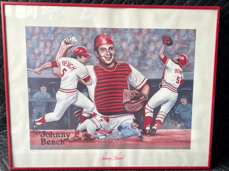 Work of Don Sprague autographed by him and the player Johnny Bench